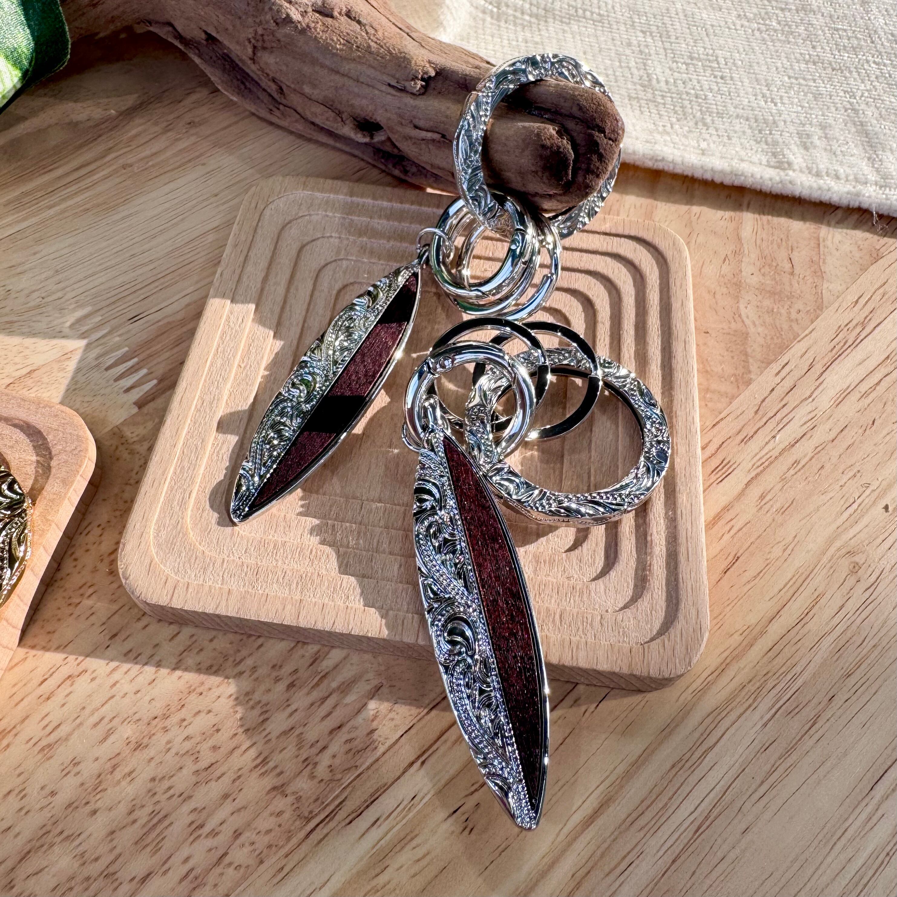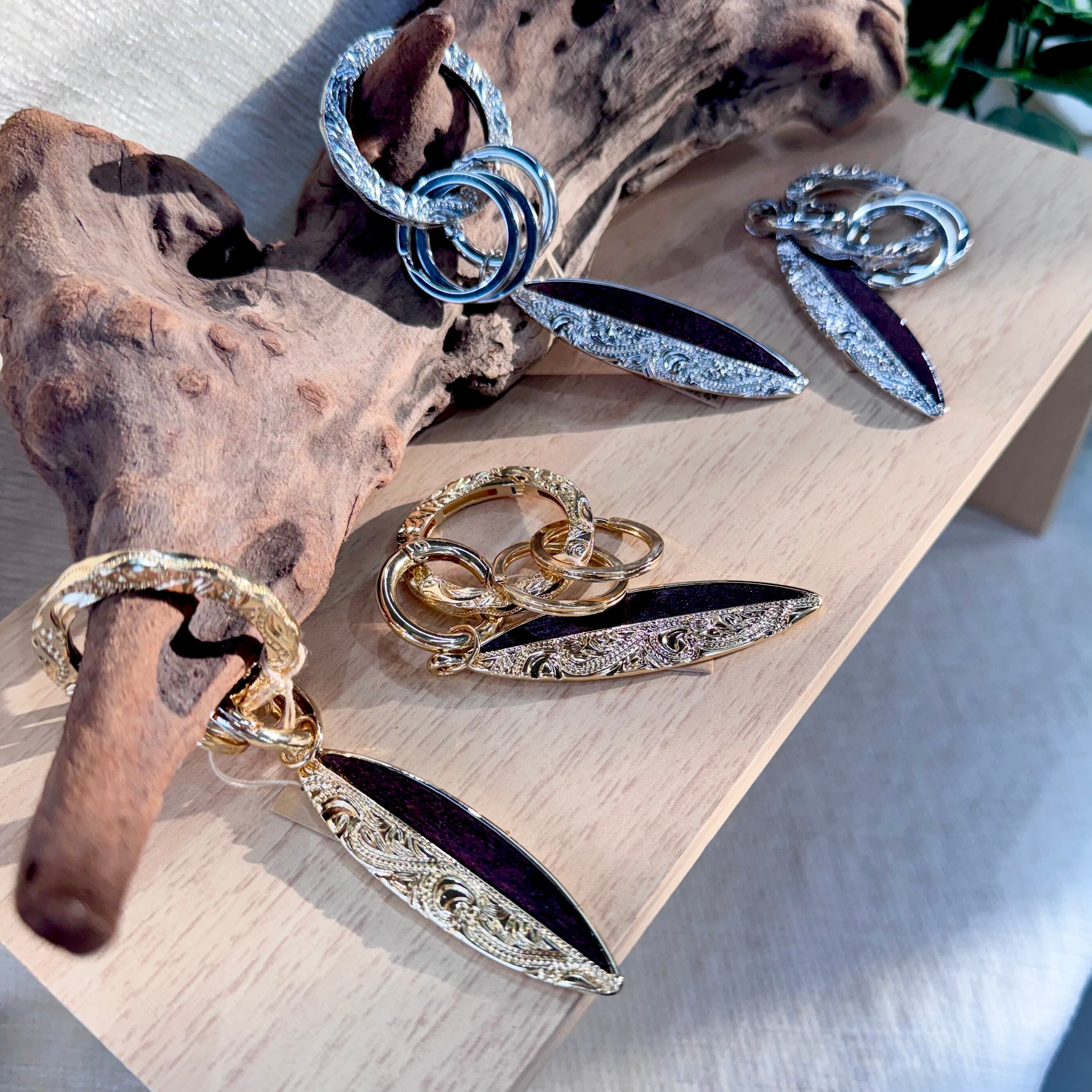 ハワイアンジュエリーでもポピュラーに使われているスクロール(波)柄が刻まれたサーフボード型のキーホルダー