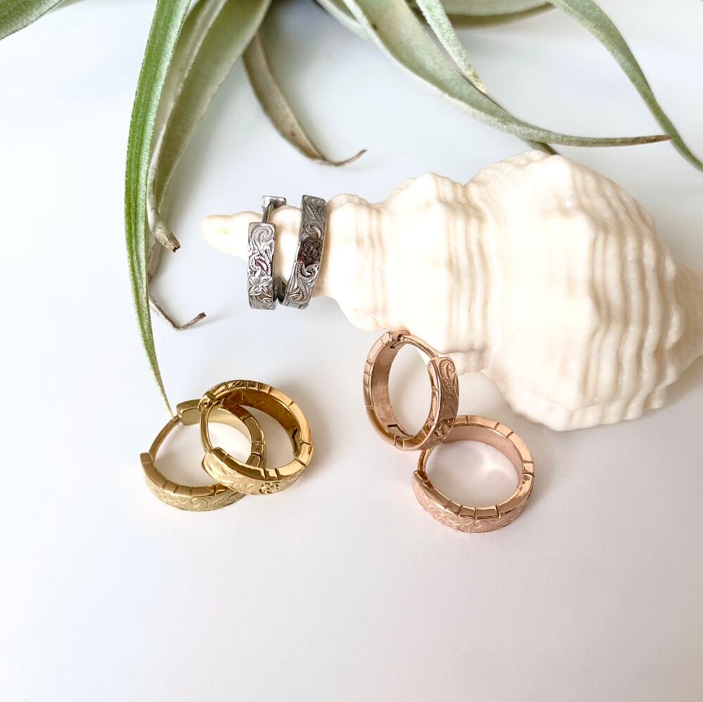 深めの彫りが綺麗で表はホヌ、裏にはプルメリアが刻まれたこだわりフープピアスです♪