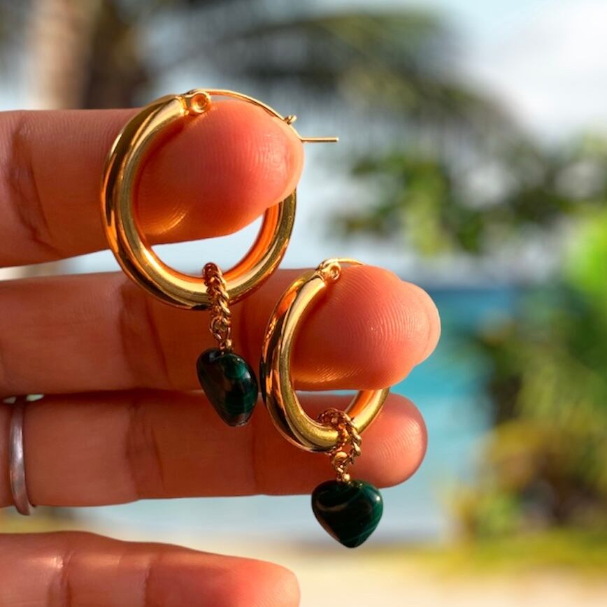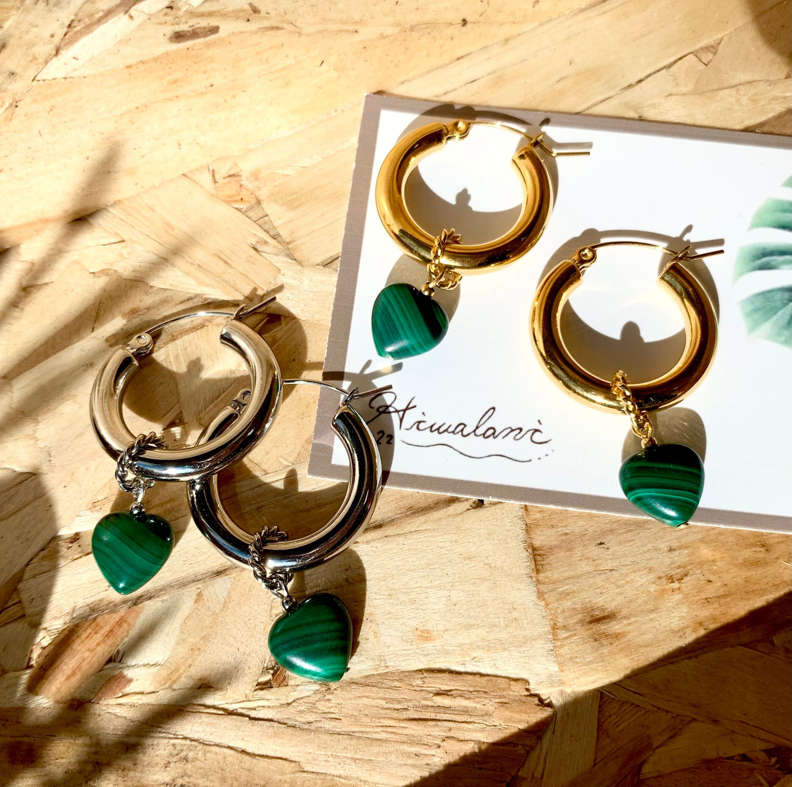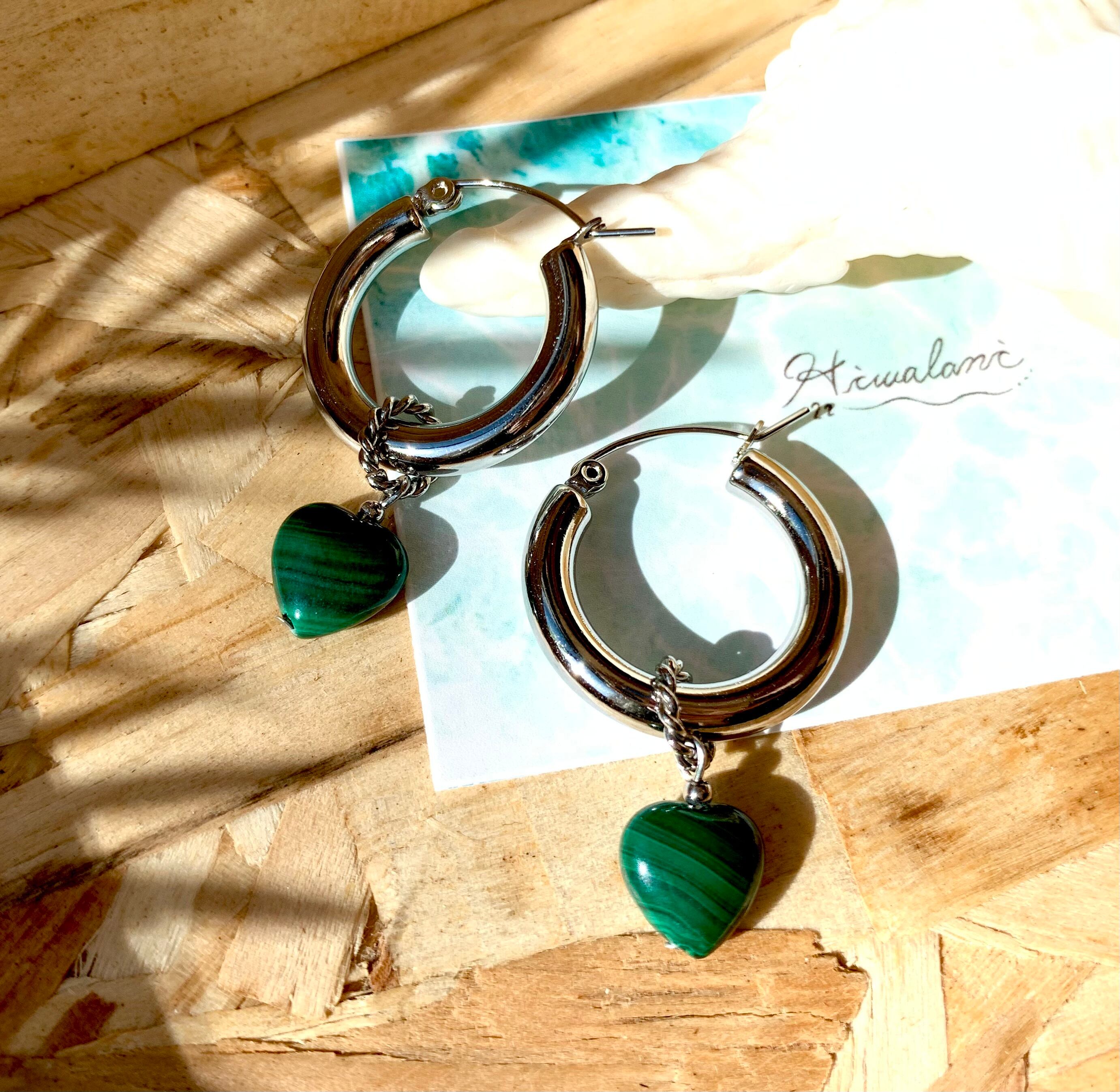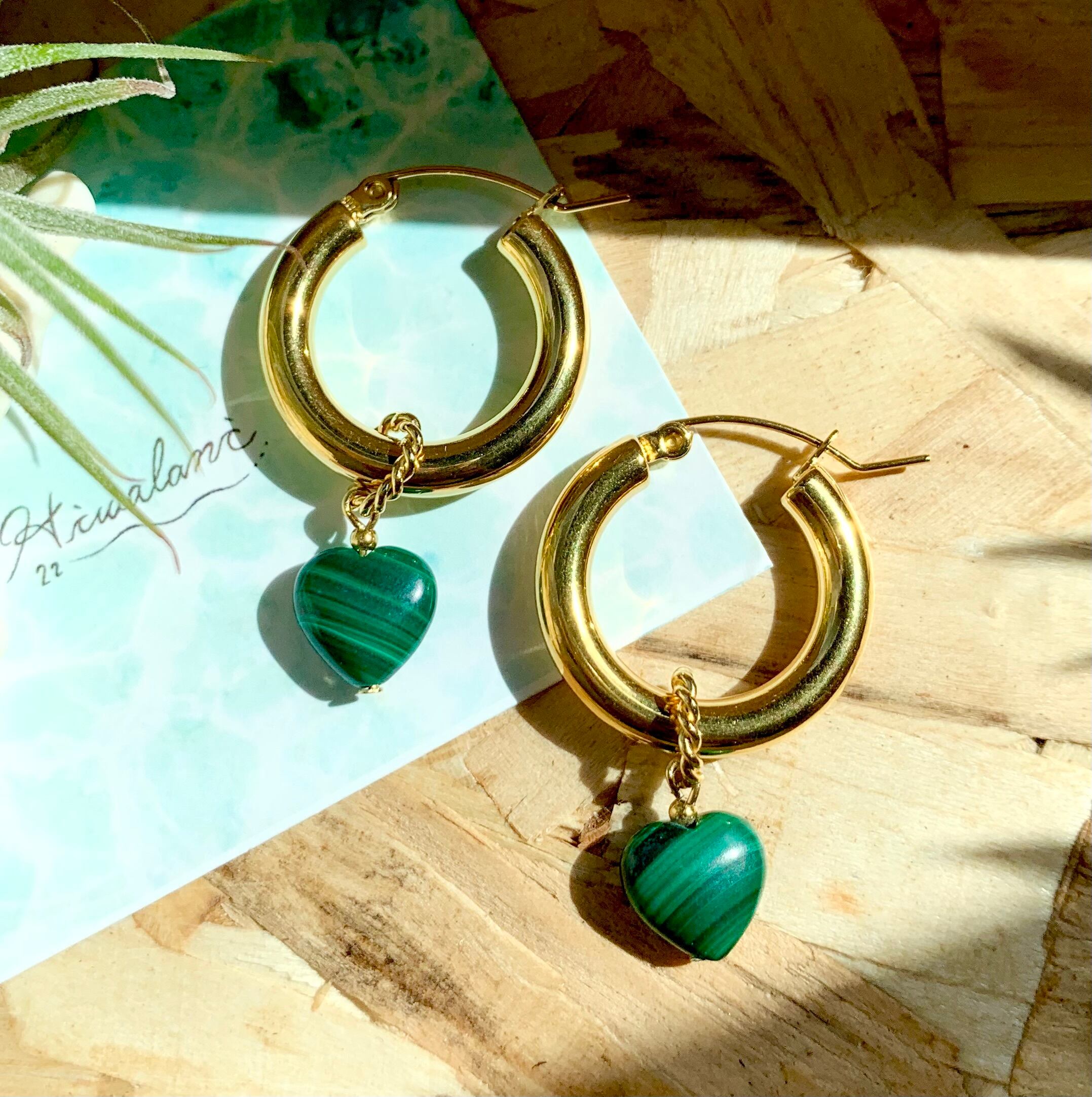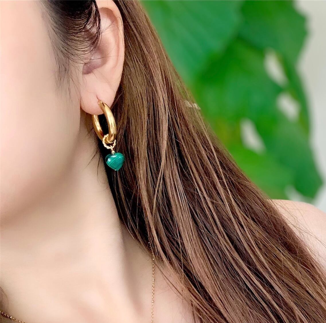 【 2way 】【 天然石 AAAランク】 ハートマラカイト チャンキー フープピアス ( ゴールド / シルバー ) 天然石 / サージカルステンレス SUS 316L / つけっぱなし 錆びない / ニッケルフリー 金属アレルギー対応 / 太め / 送料無料 / ギフト
