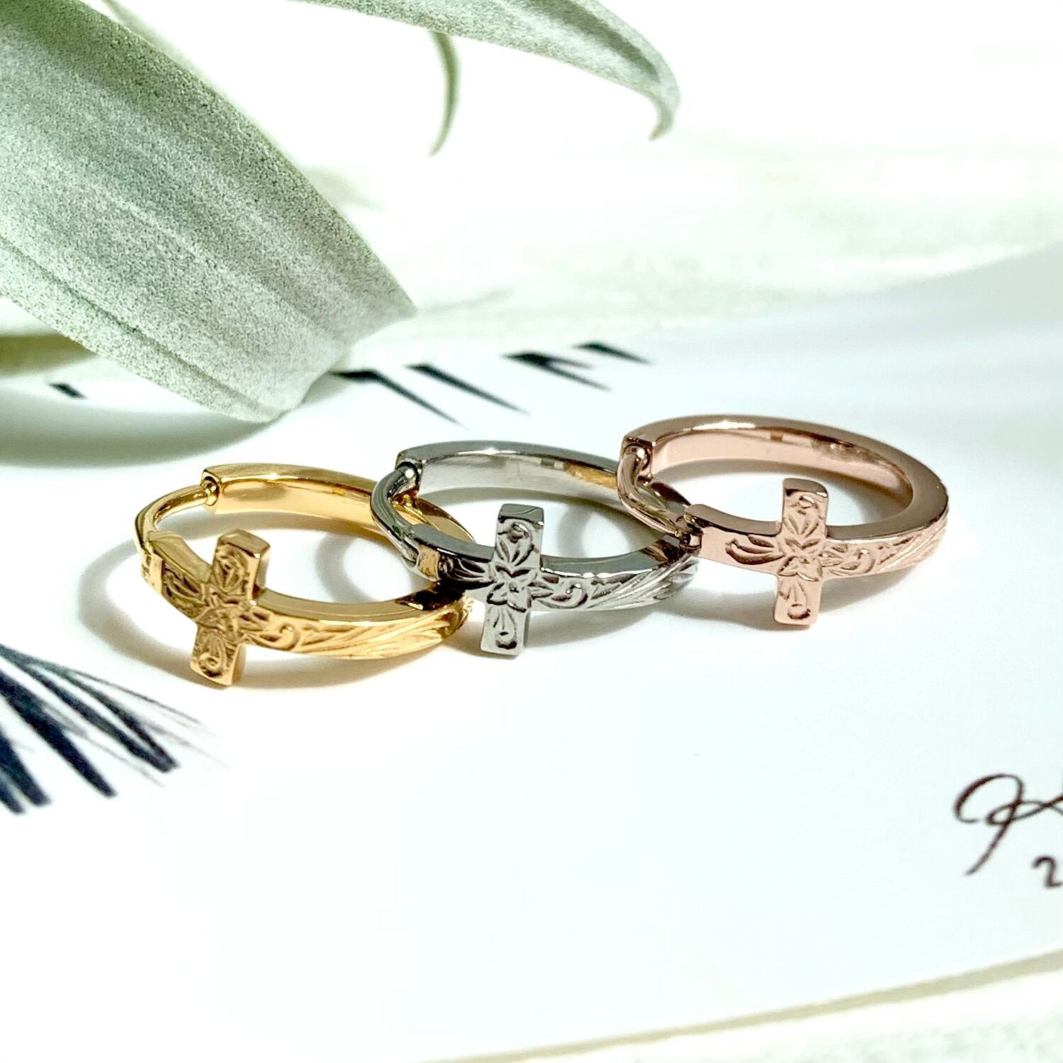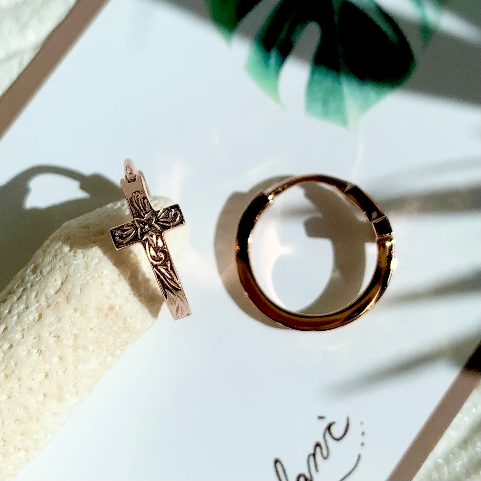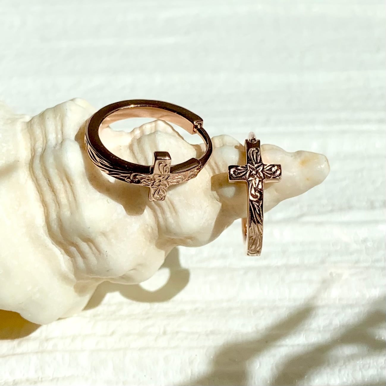【 ハワイアンジュエリー 】 クロス フープ ワンタッチ ピアス ( ピンクゴールド ) サージカルステンレス SUS 316L / 錆びない / ニッケルフリー 金属アレルギー対応 / ハワジュ 十字架 / ギフト