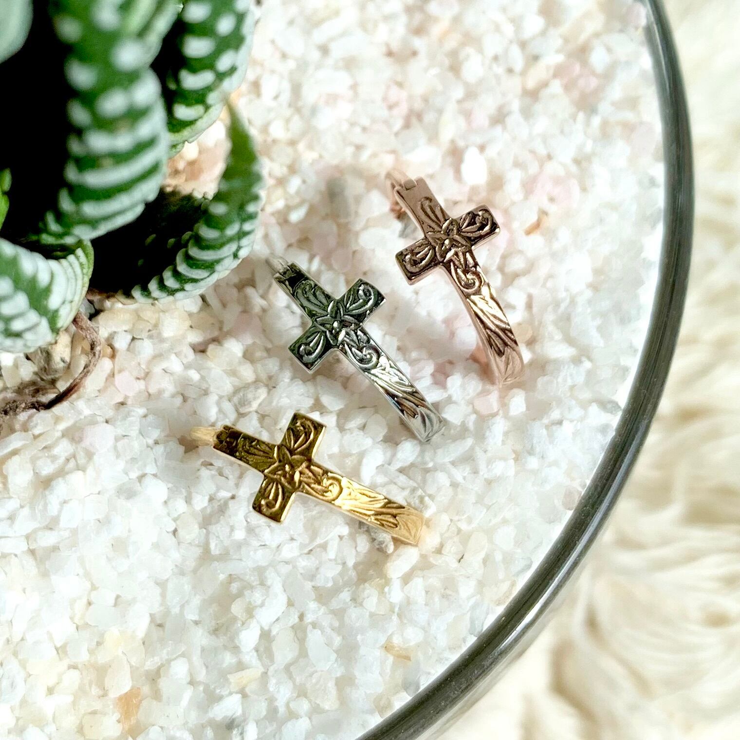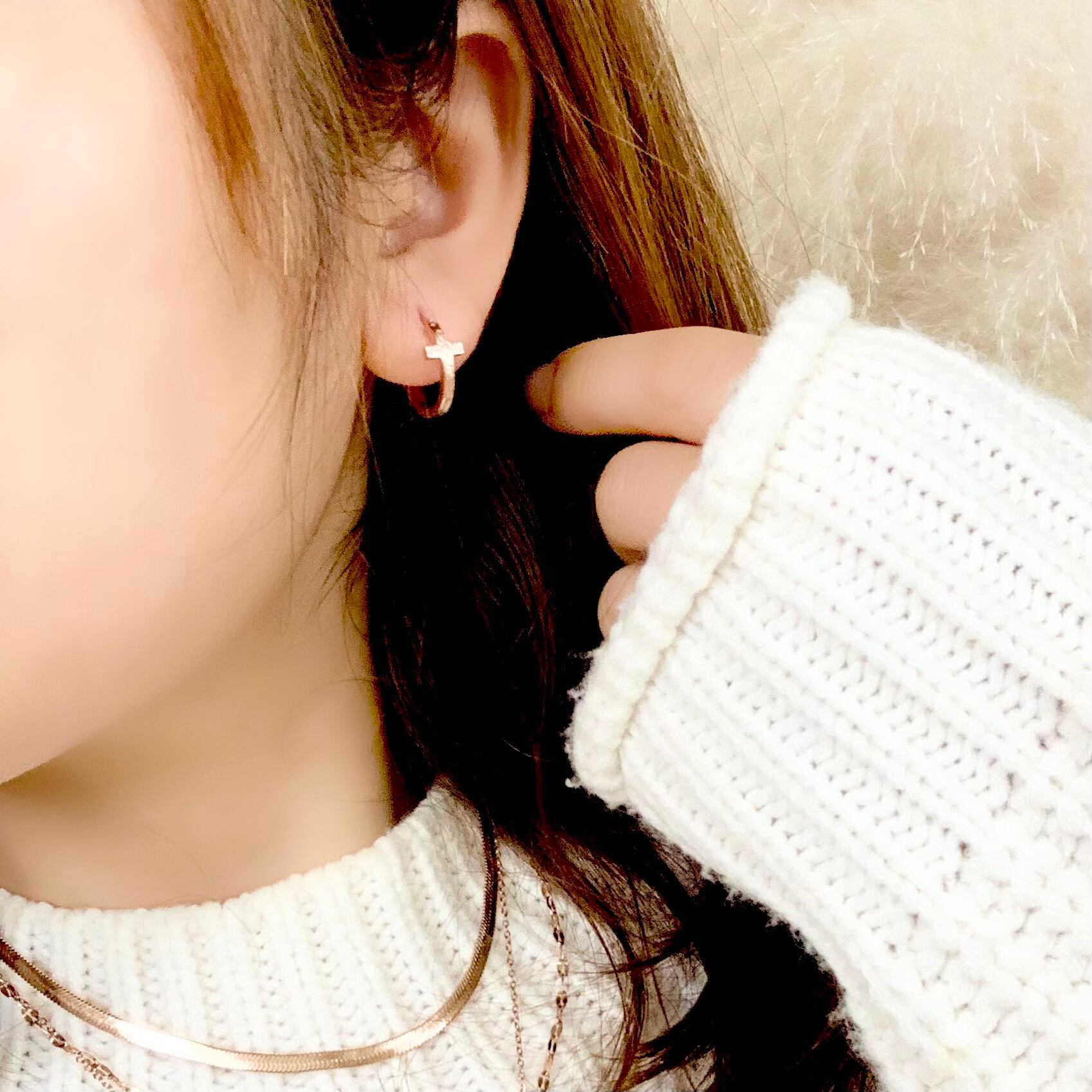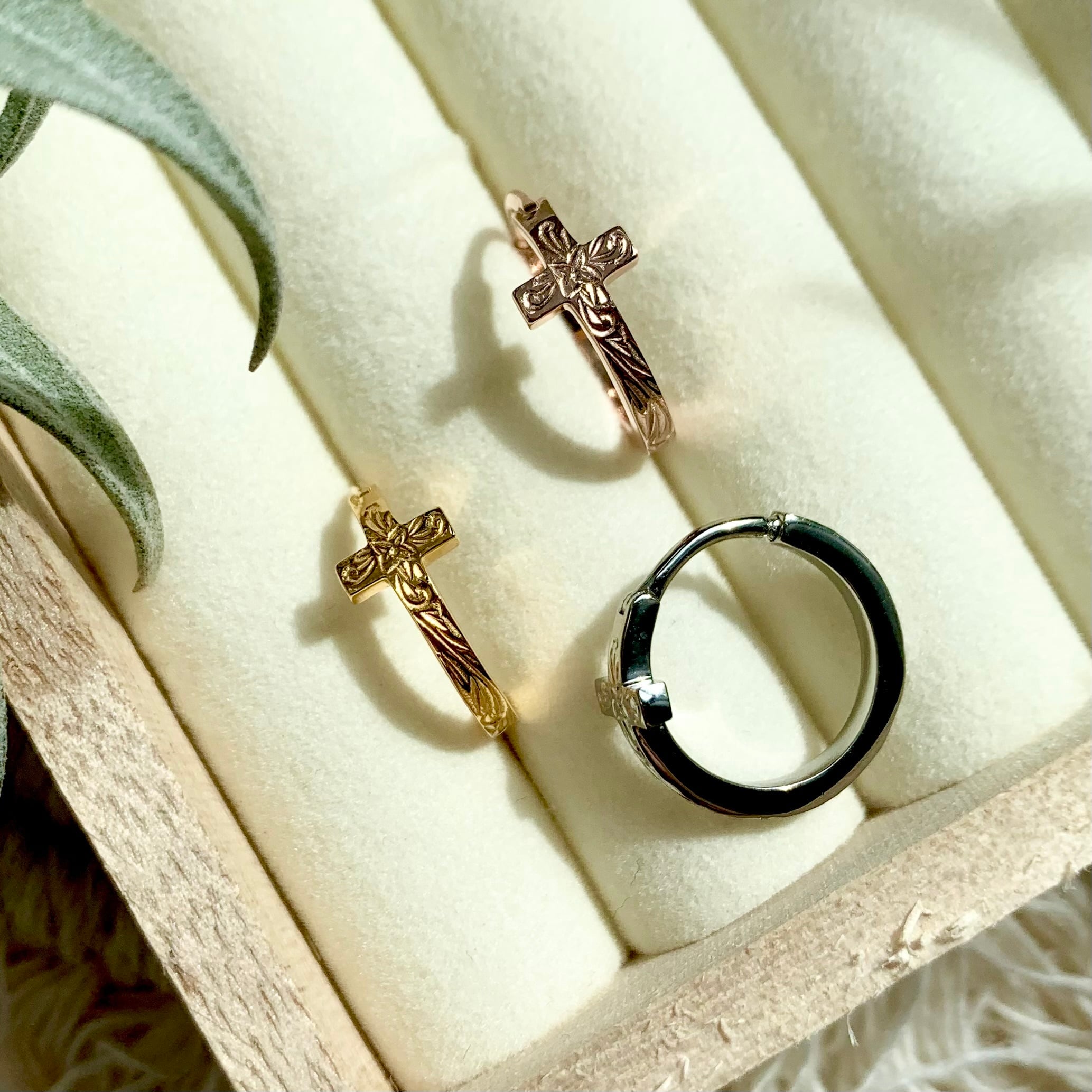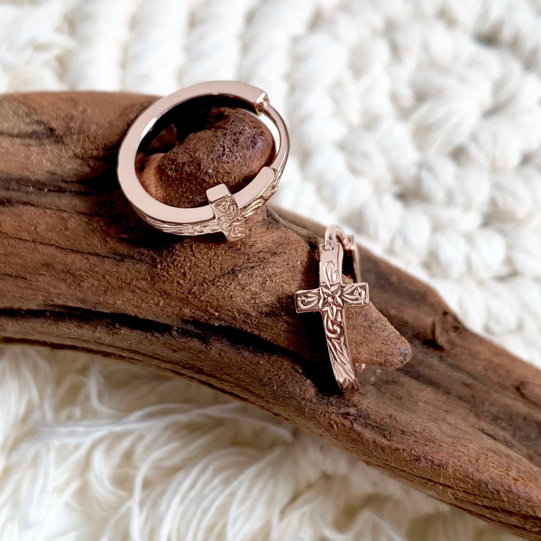 【 ハワイアンジュエリー 】 クロス フープ ワンタッチ ピアス ( ピンクゴールド ) サージカルステンレス SUS 316L / 錆びない / ニッケルフリー 金属アレルギー対応 / ハワジュ 十字架 / ギフト