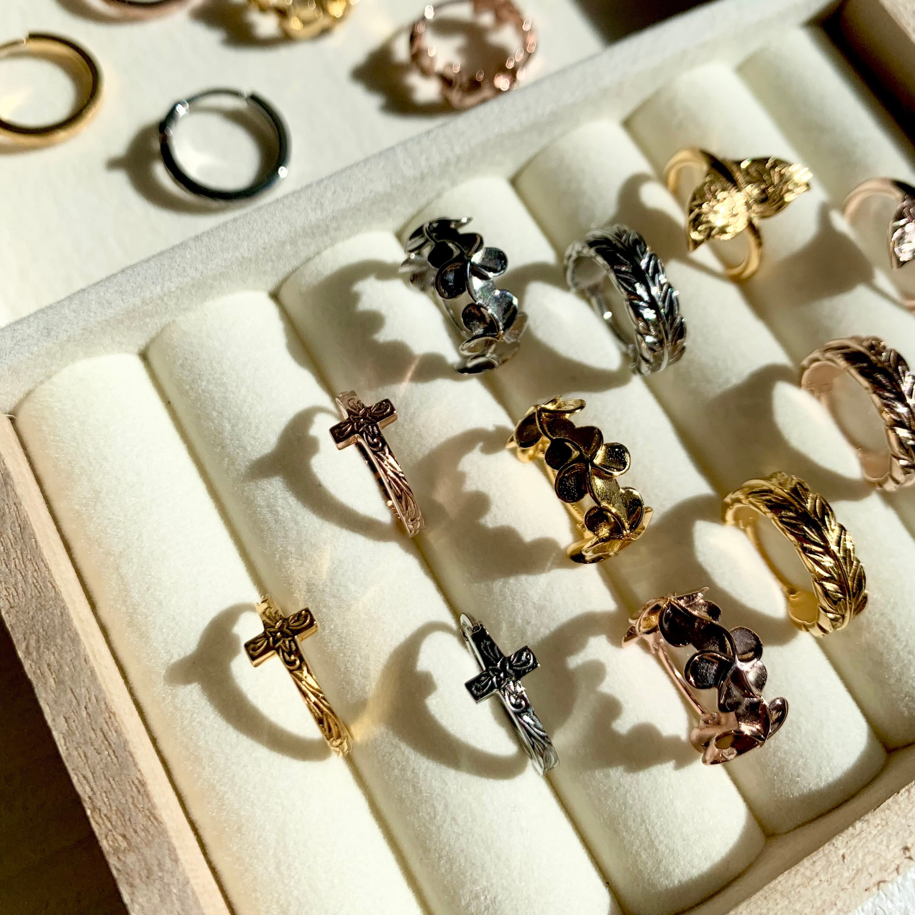 ゴールドやピンクゴールド等の色を付けるのに通常のメッキ加工はニッケルが必要となりますが、特殊なメッキ加工コーティングによりニッケルを使わない事で一層金属アレルギーが起こりにくくなっております。